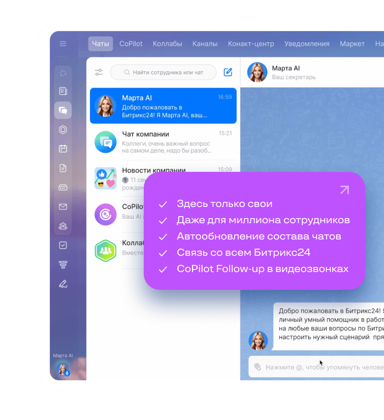 Быть уверенным, что вам пишет или звонит именно ваш коллега — невероятно ценно. Битрикс24 — это ваш закрытый контур, где только свои. Мошенничество и спам здесь исключены.