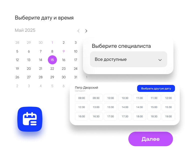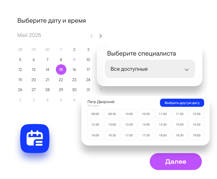 Клиенты могут записываться сами. Добавьте форму на сайт и поделитесь ссылкой в Telegram или других каналах. Клиенты сами выберут время, дату, специалиста и внесут предоплату — ваш бизнес сможет получать заказы 24/7 без участия менеджеров.