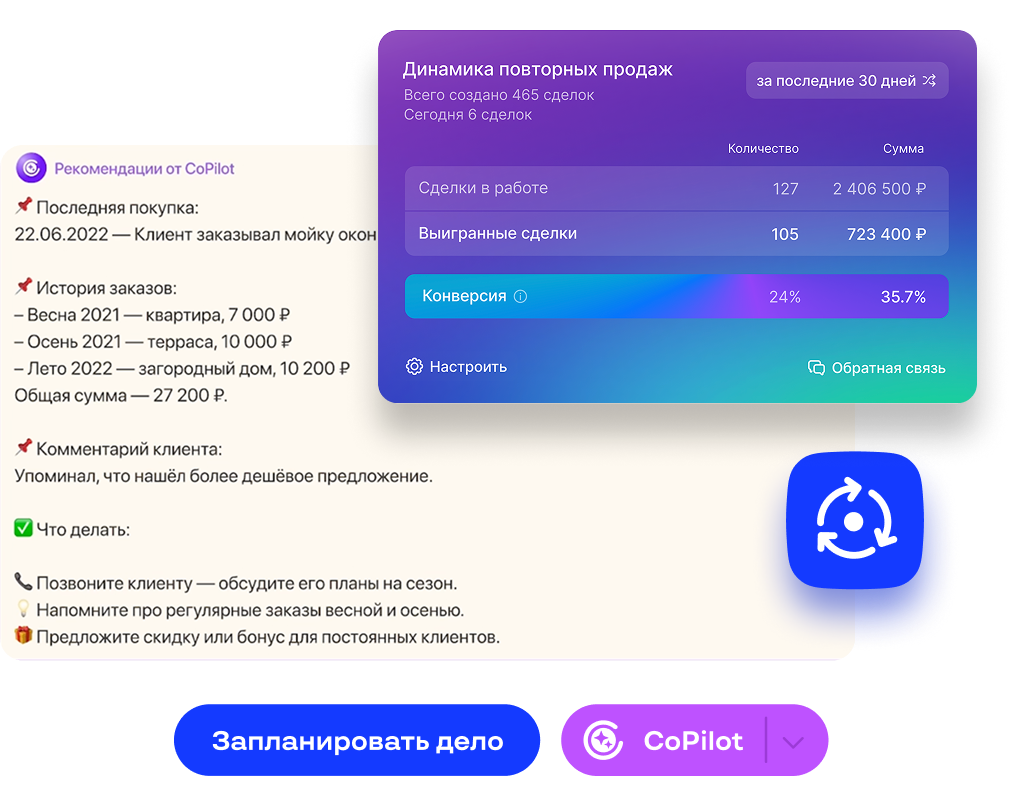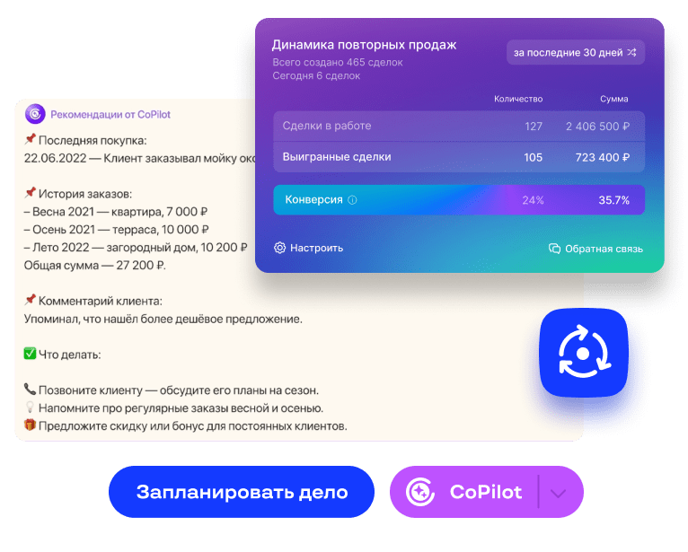 Это выгоднее, чем искать новых клиентов. AI знает, как увеличить прибыль вашей компании. Проанализирует клиентов, создаст сделки и подскажет, что предложить. Вам остается только связаться с покупателем и завершить продажу. Всё!